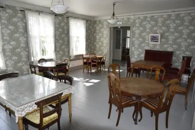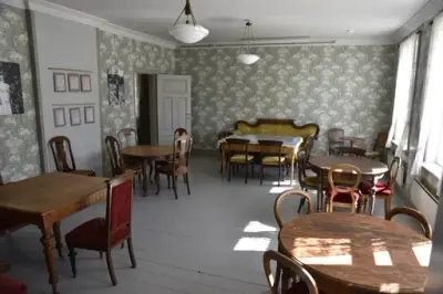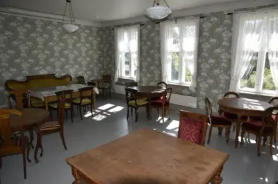 Rynningsalen har utsikt nedover Festningsgata og har flere sittegrupper med eldre stilmøbler. Kongsvinger museum - 3/5