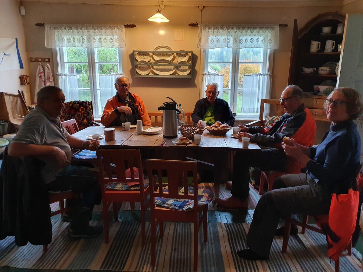 Ved Eidskog museum er det gjort betydelig oppryddingsarbeid ved flere av anleggene, og det store arbeidet med å flytte Iver-smia fra Skotterud til Almenninga på Vestmarka er godt i gang. Dugnadsgjengen har stått på og gjort uvurderlig innsats. Her er gjengen samlet i en velfortjent kaffepause. Foto: Line Helstad.