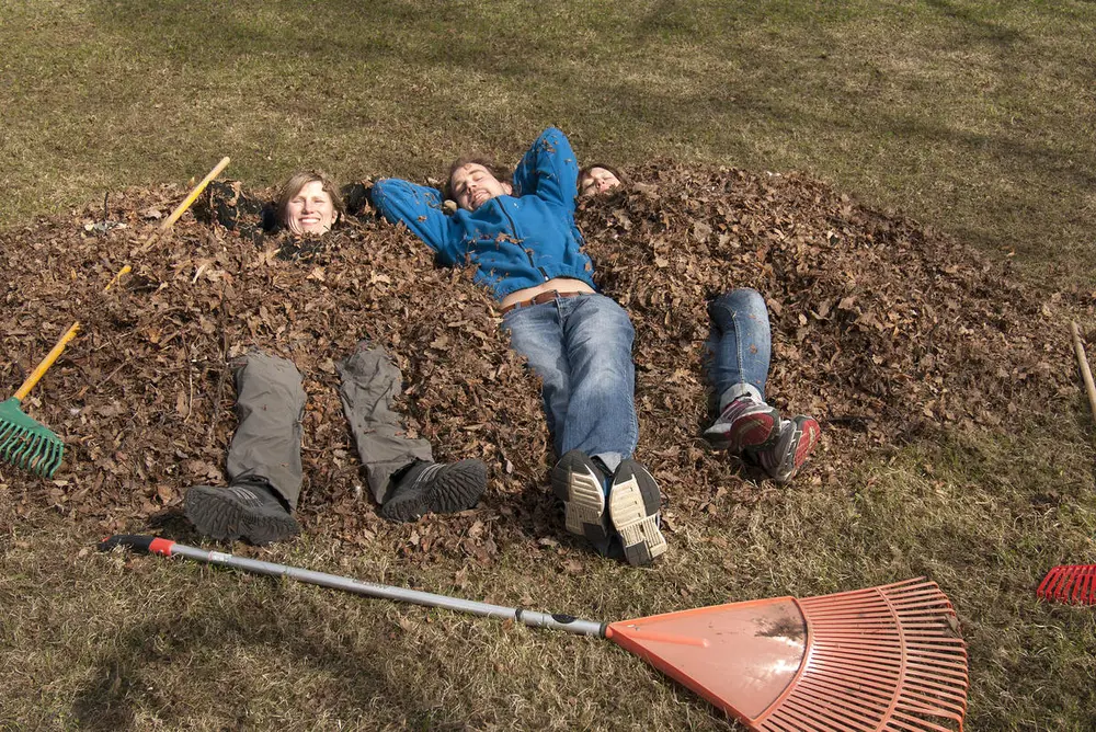 Ansatte ved Domkirkeodden tar seg en hvil etter rydding og raking ute på det 200 mål store friluftsmuseet. Foto: Domkirkeodden.