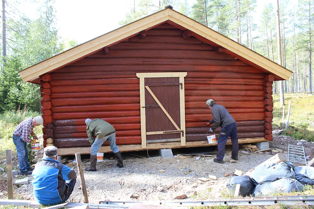 Flytteprosjektet, Engeroskoia som ble gjenoppført ved Engerneset Samfunnshus. Stor dugnadsinnsats av Engerneset Vel har gitt god framdrift og gode resultater. Deler av dugnadsgjengen i arbeid.
