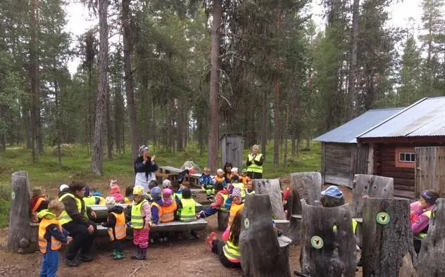 Formidling av lokal kulturhistorie til en gruppe barnehagebarn samlet foran tømmerkoia Anglebekken på Blokkodden villmarksmuseum.